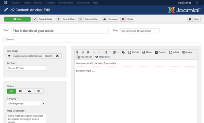 d2 Content works along with Joomla's standard Articles Manager (com_content) and with your existing articles and custom fields (since 2.1 PRO).